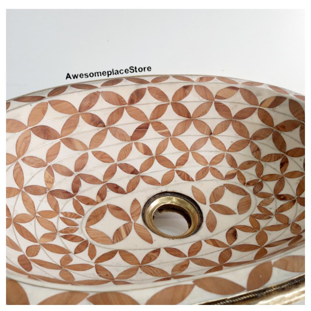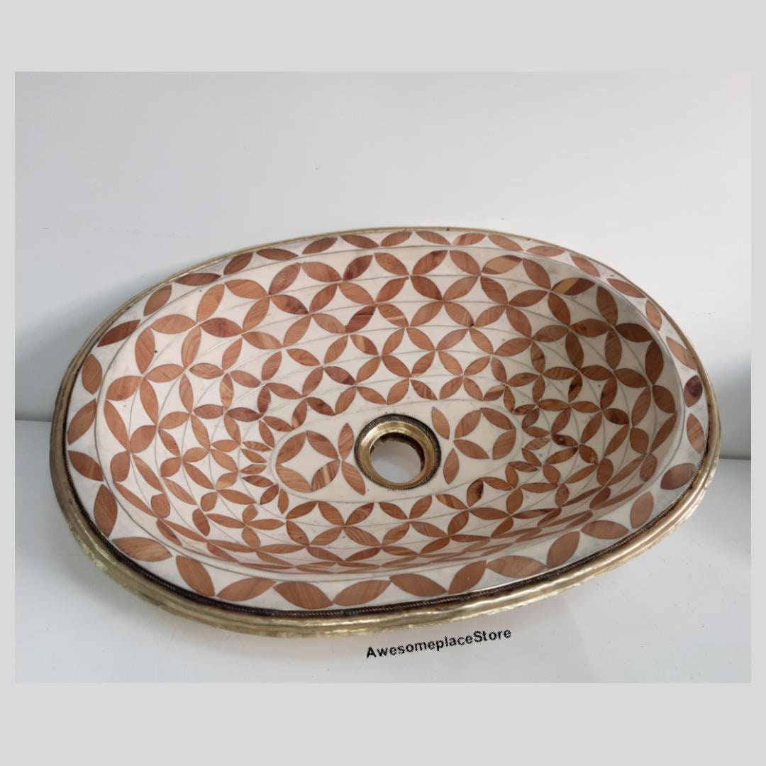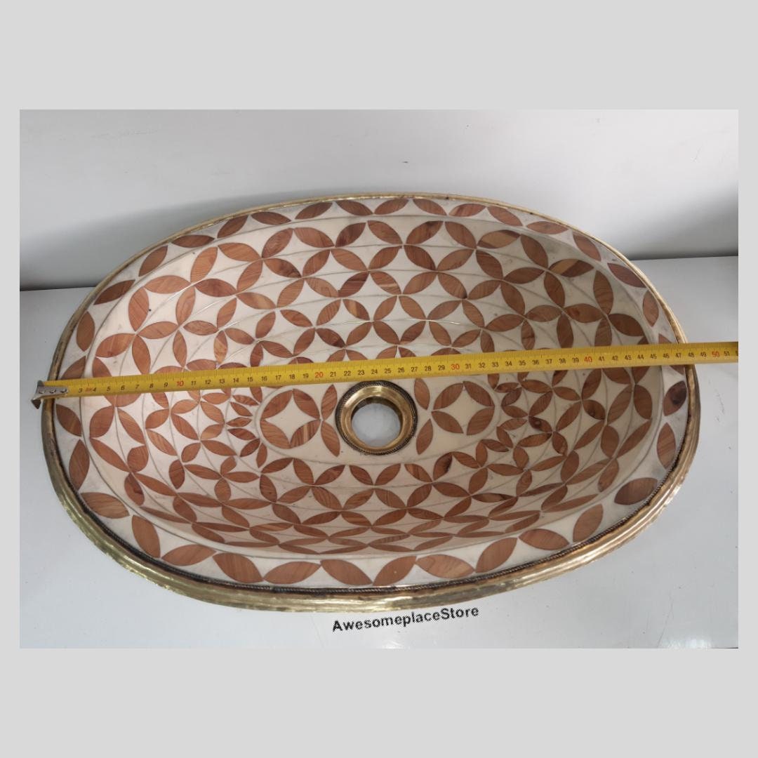 - Let the Wood and Brass enhance your powder room. Perfect for spaces of all styles, this transitional piece with decorative wood design is just as elegant as it is durable. Made from solid brass and covered by Argan wood. To complete your upgrade, pair the Wood and Brass with a matching faucet of your choice