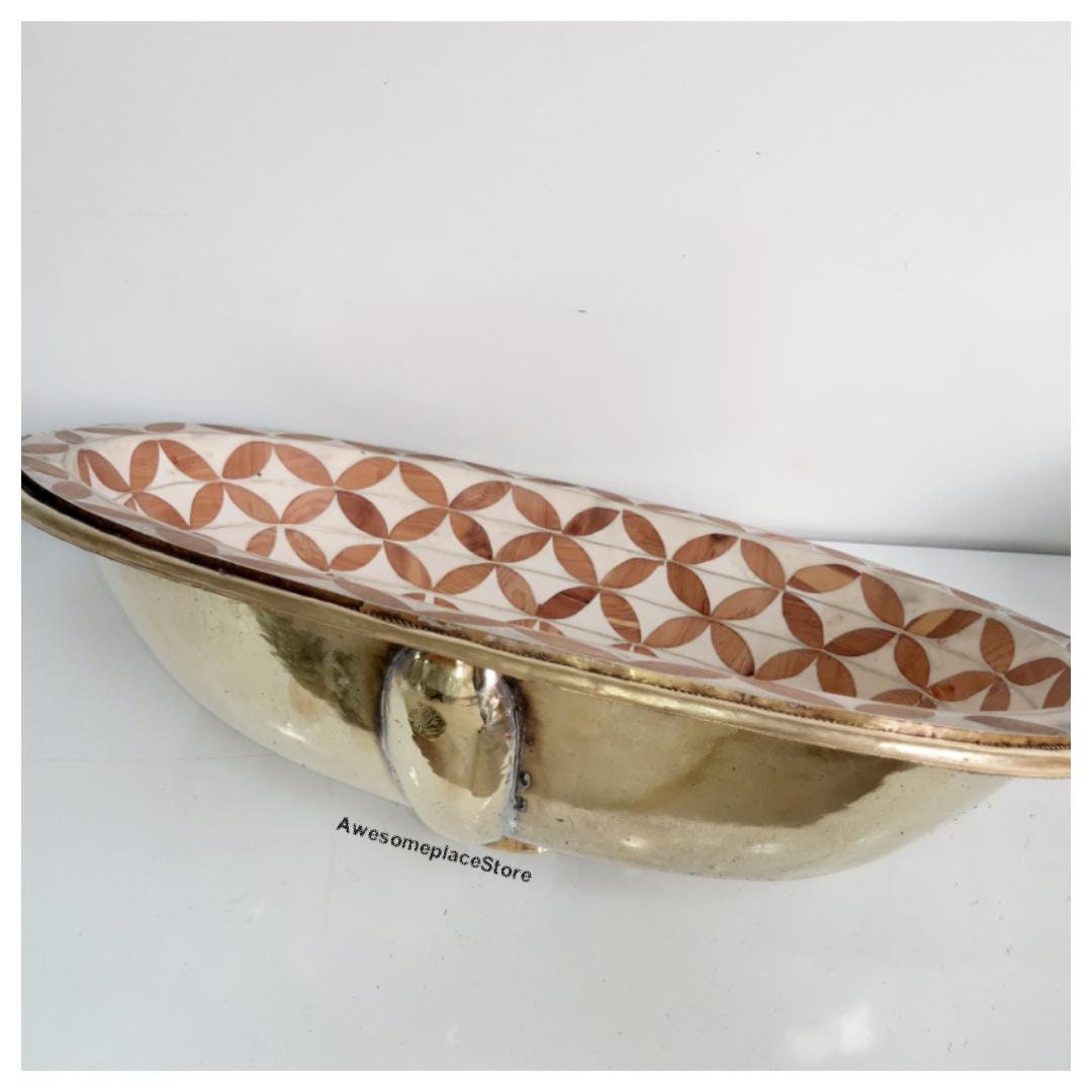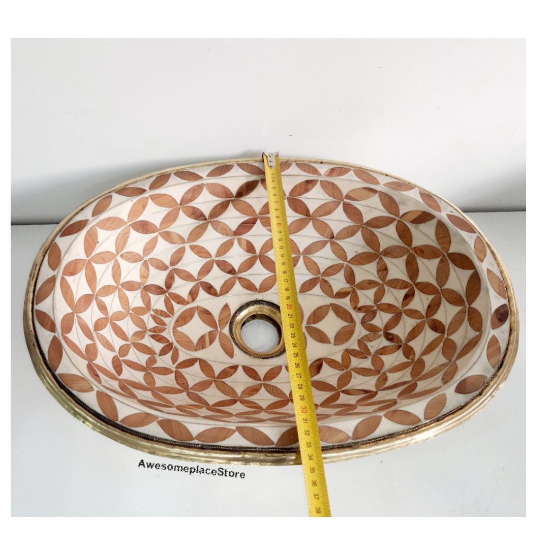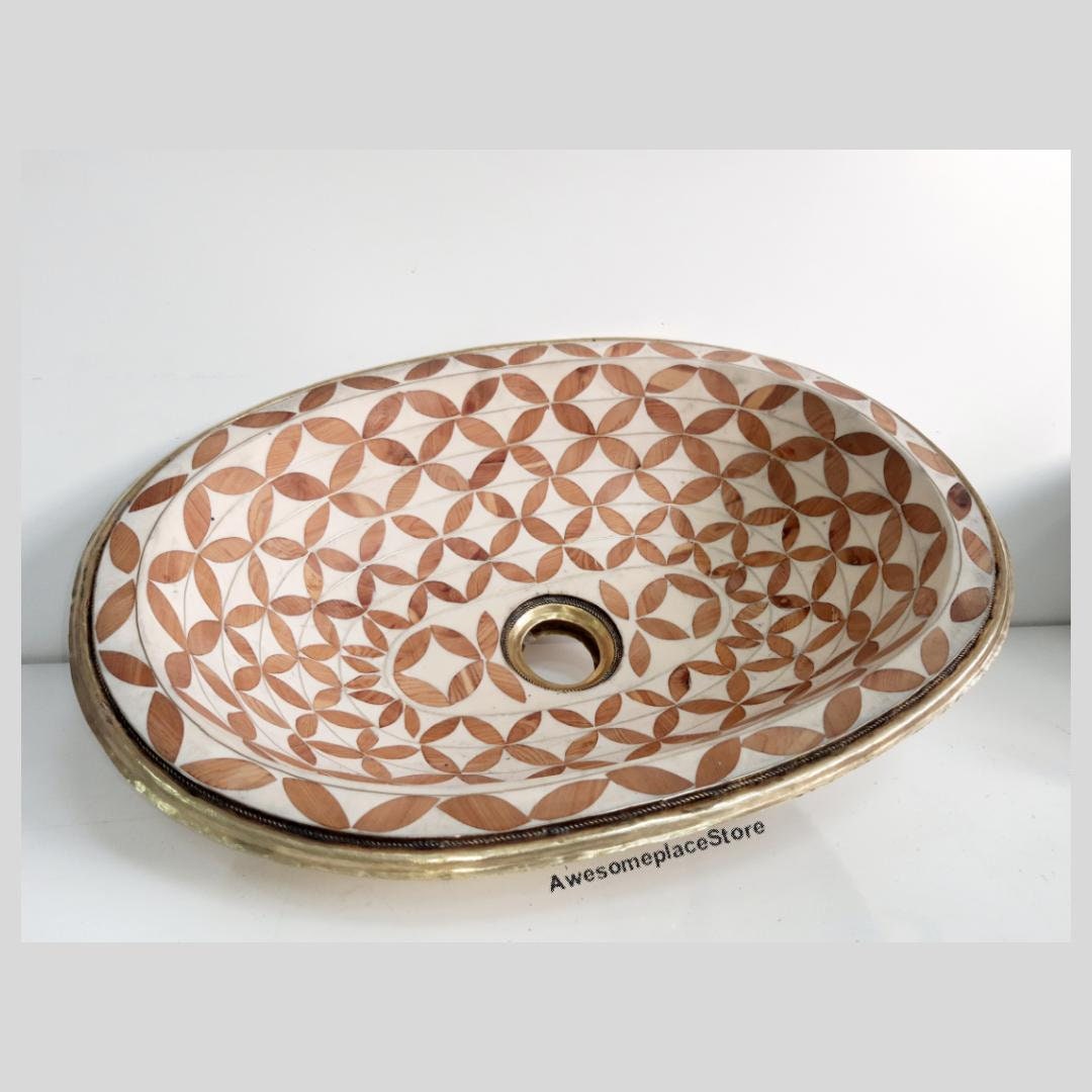 - Let the Wood and Brass enhance your powder room. Perfect for spaces of all styles, this transitional piece with decorative wood design is just as elegant as it is durable. Made from solid brass and covered by Argan wood. To complete your upgrade, pair the Wood and Brass with a matching faucet of your choice