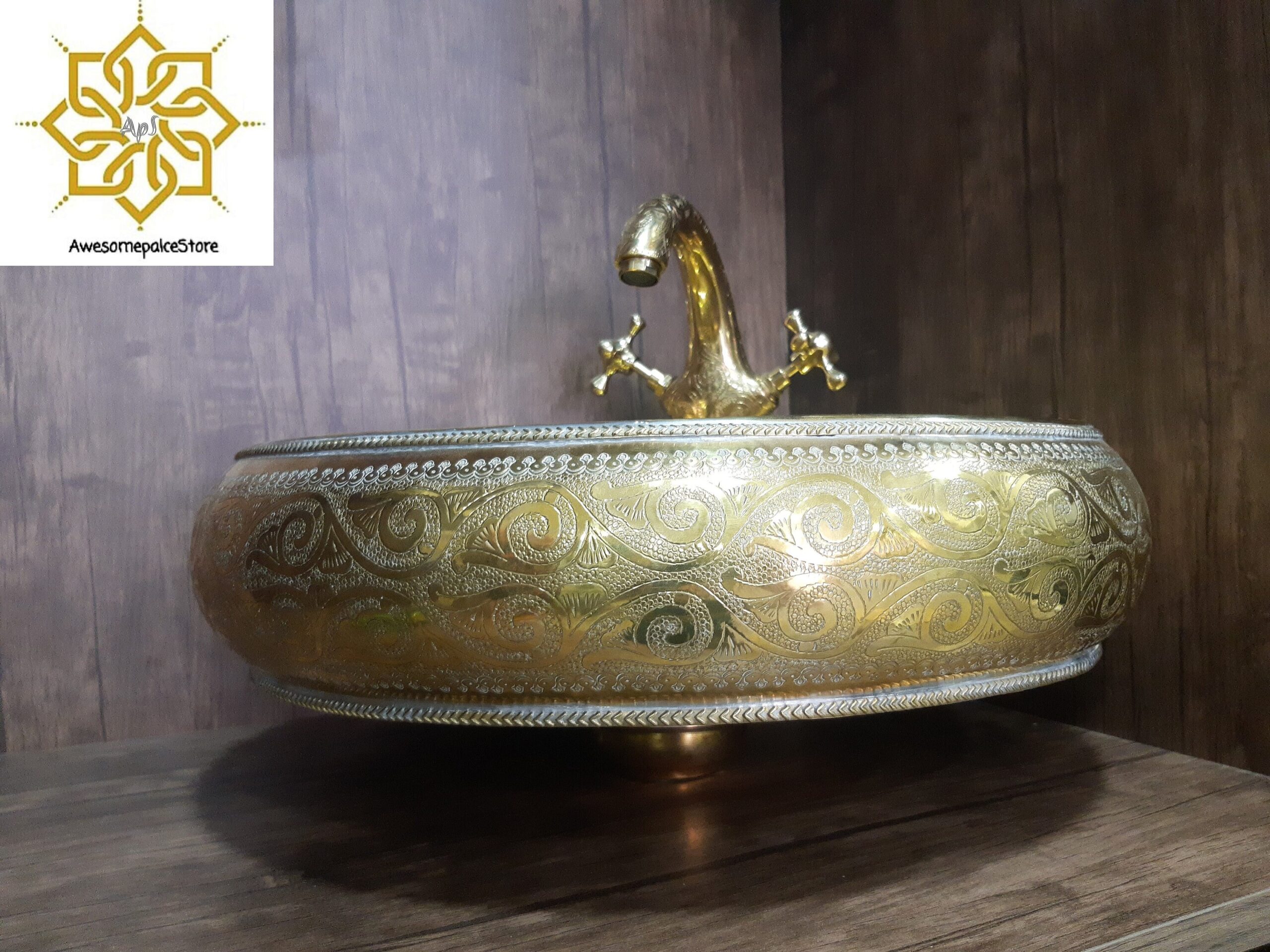 - Évier en laiton ou marocain, évier marocain en laiton martelé rond / ovale fait à la main, décor de salle de bain marocain, évier en laiton de style vintage.