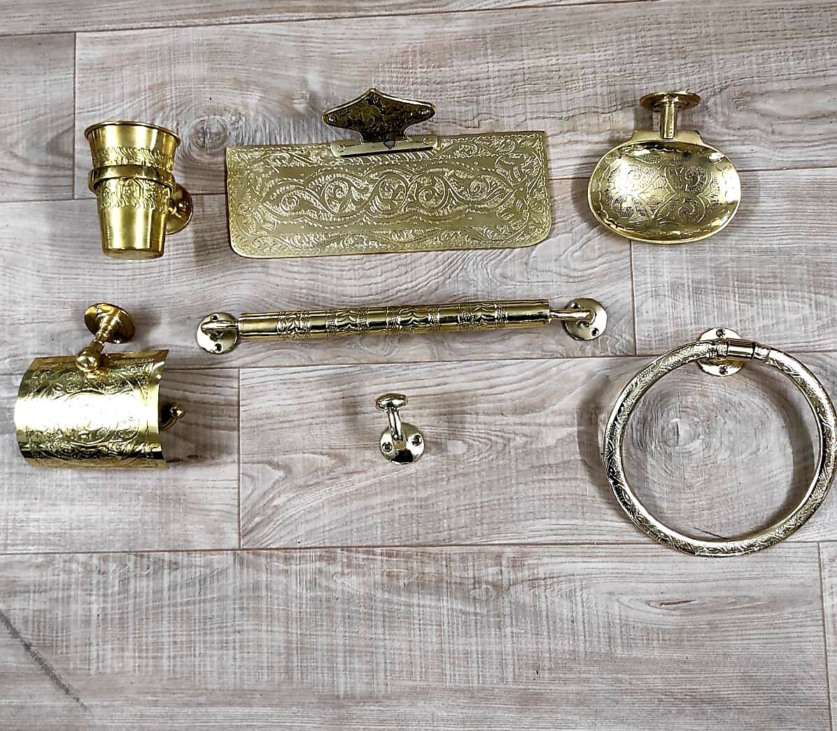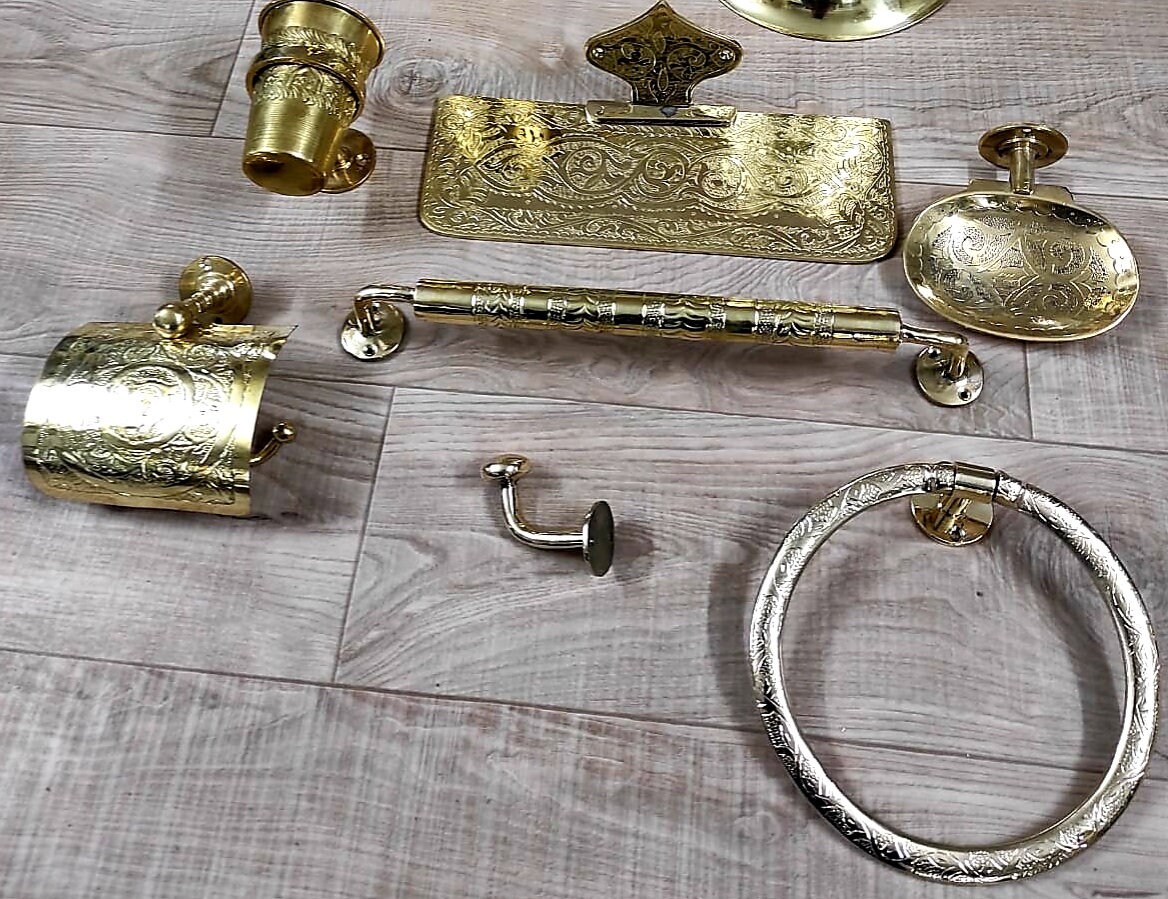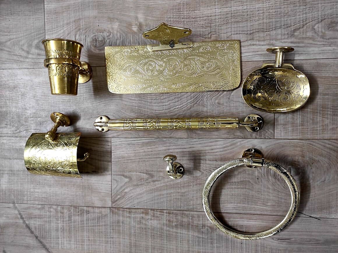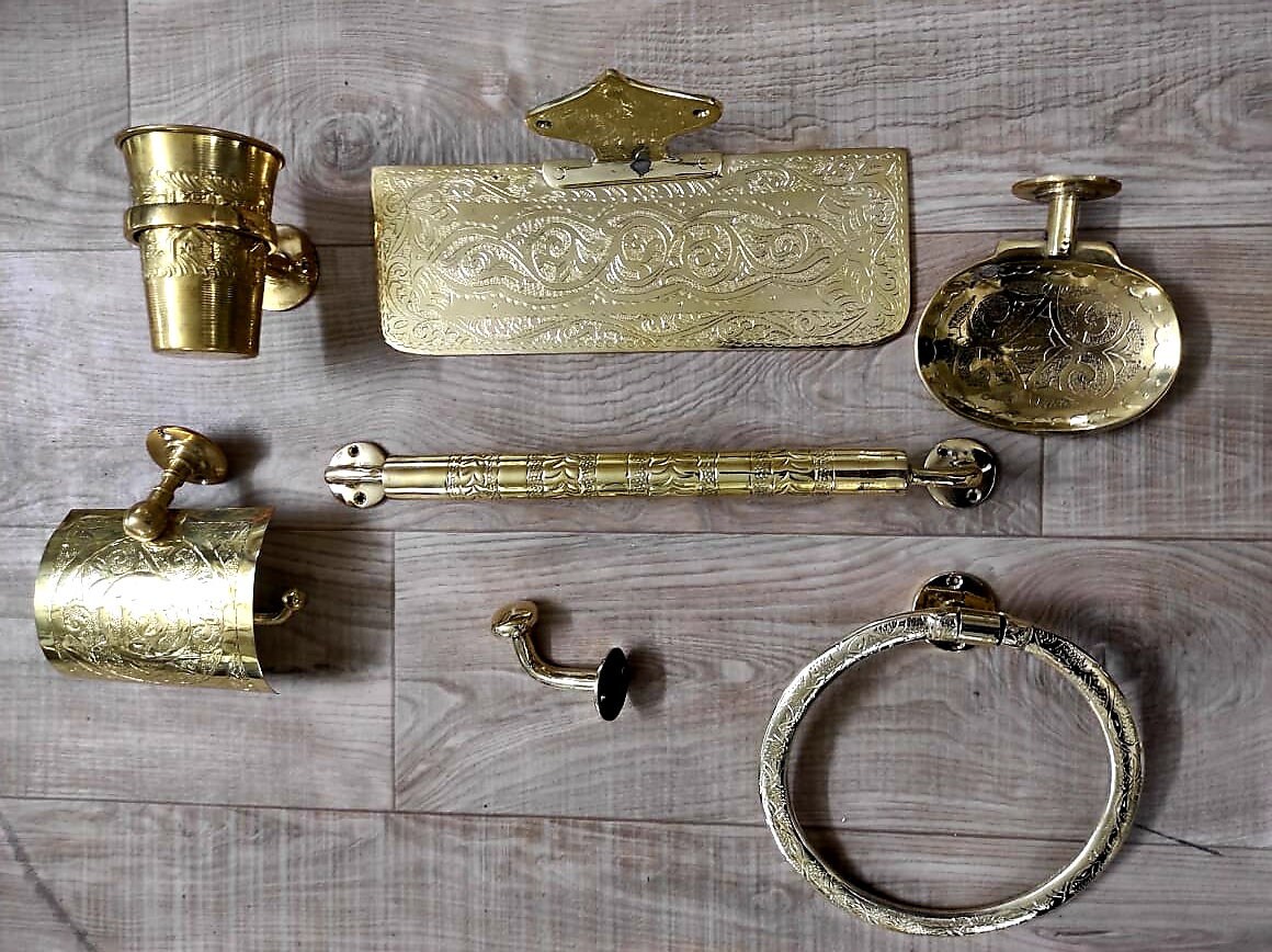- accessoires d’ensemble, support de papier toilette en laiton, porte-savon en laiton, porte-savon fait à la main, accessoires de salle de bain faits à la main au Maroc.