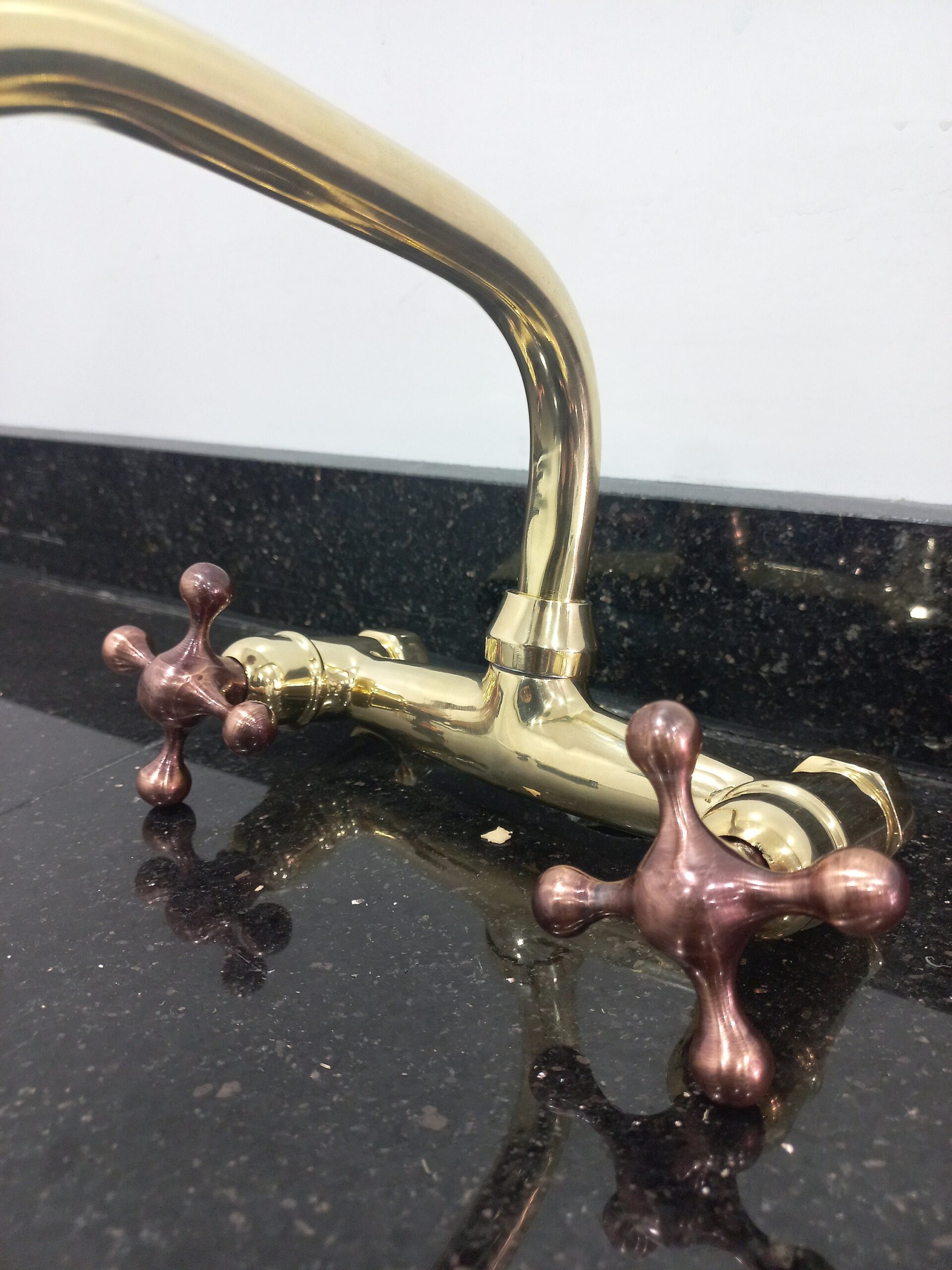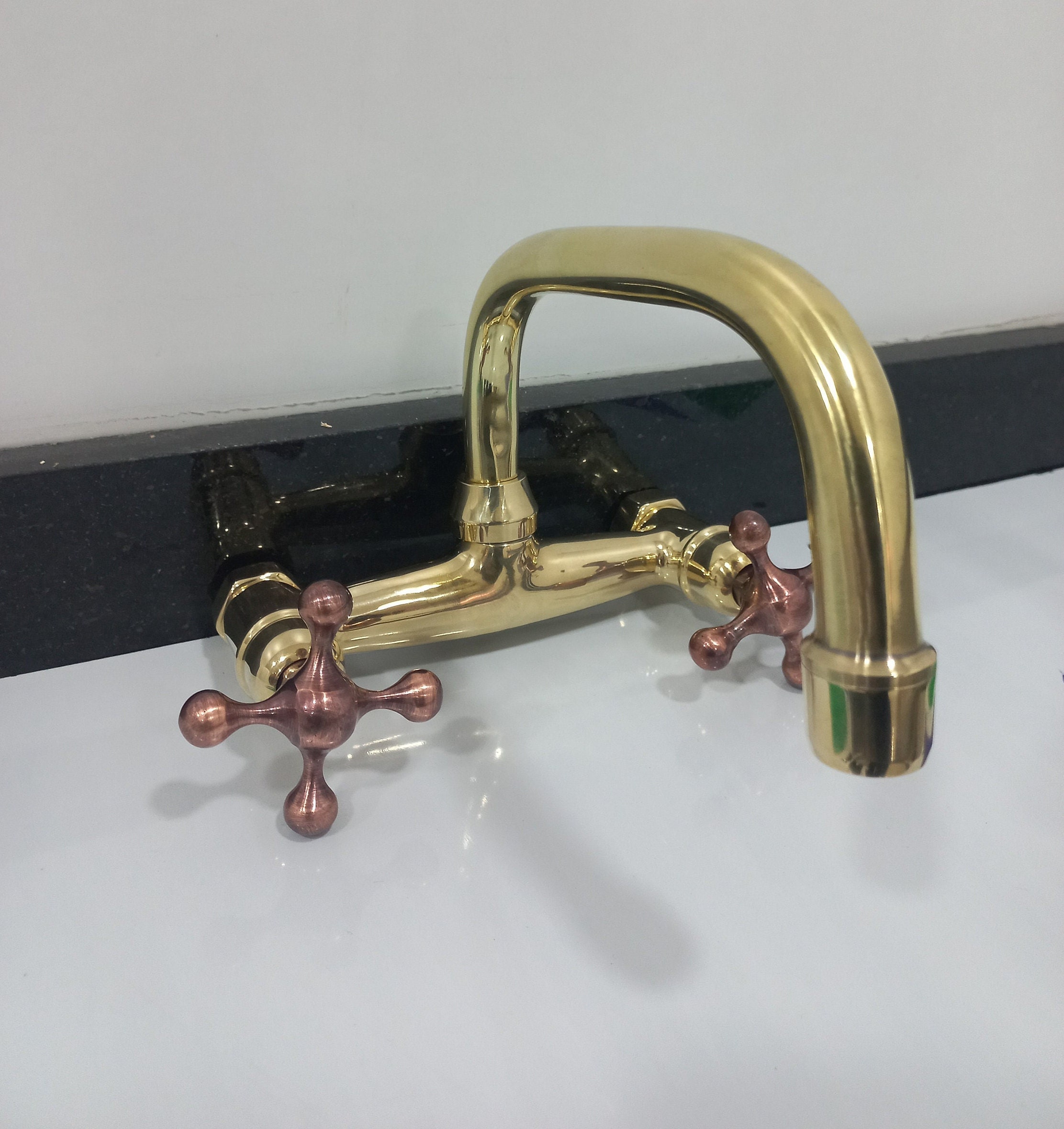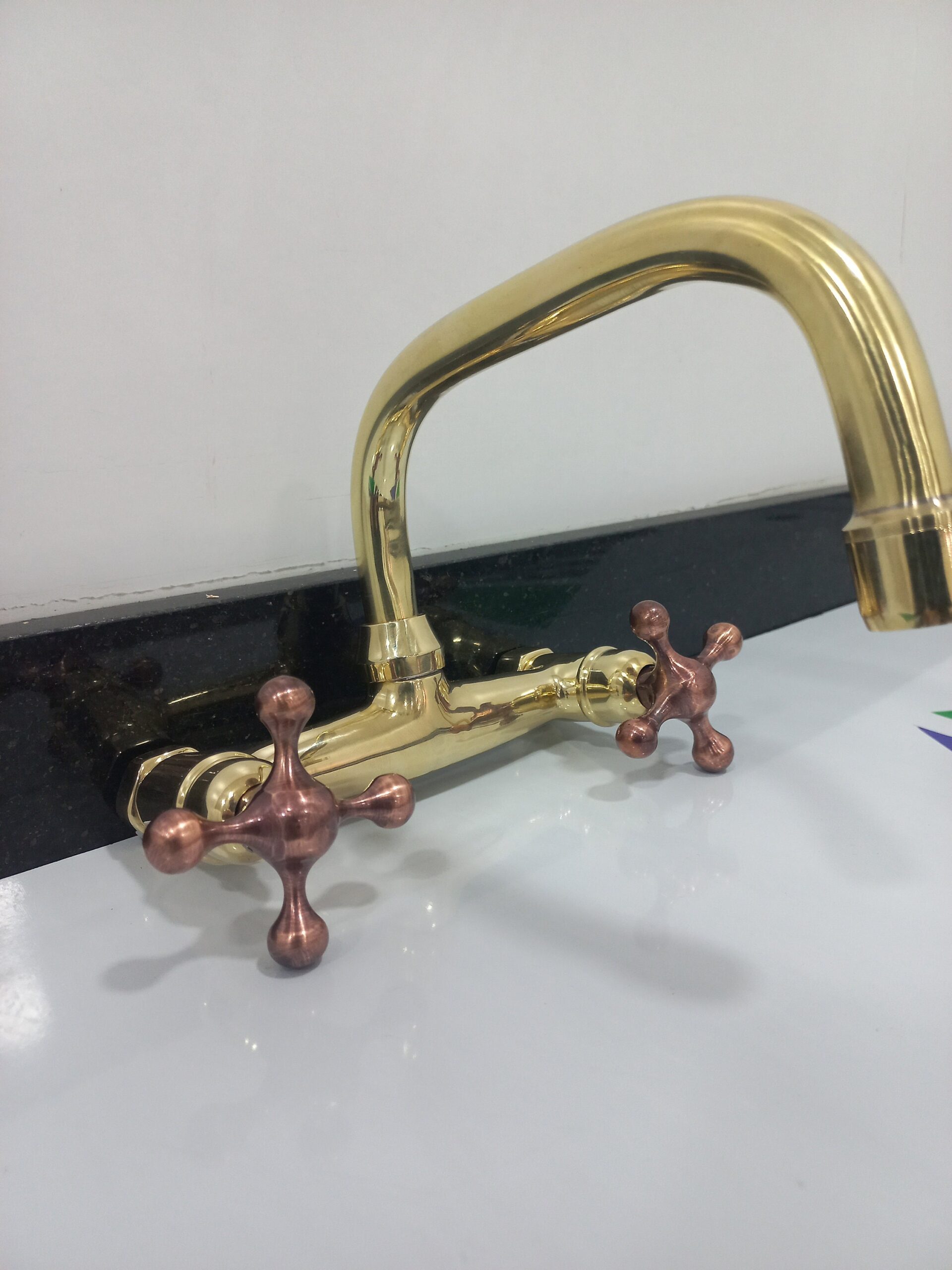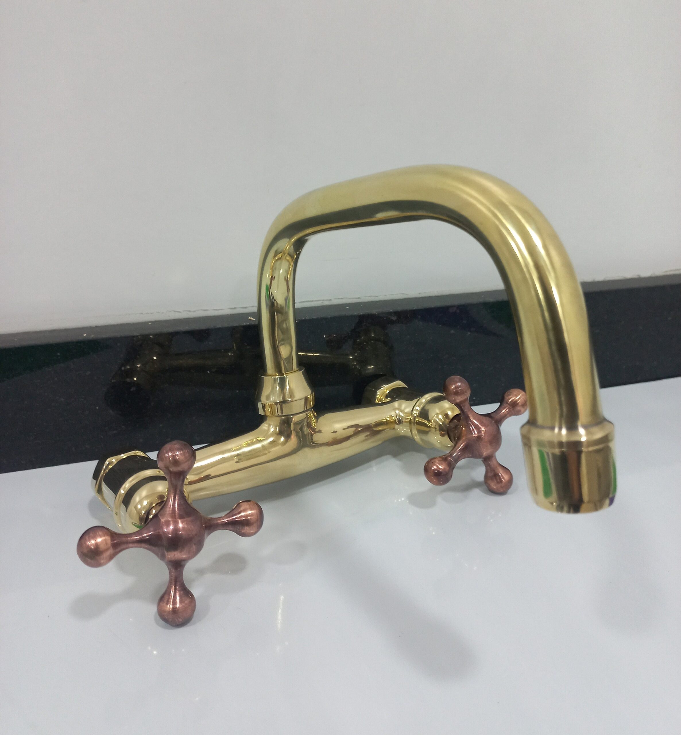 - This gorgeous solid brass kitchen faucet with short square spout is wall type, it is handcrafted and handcrafted from Morocco, exactly Marrakech, with standard American plumbing, makes it easy to install. This faucet has 2 handmade handles.