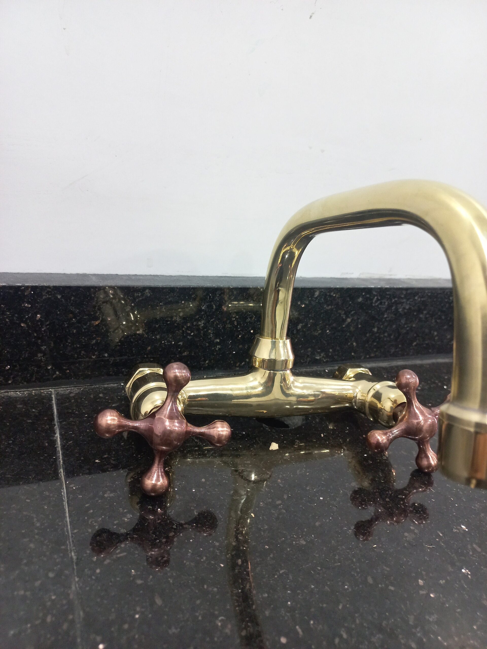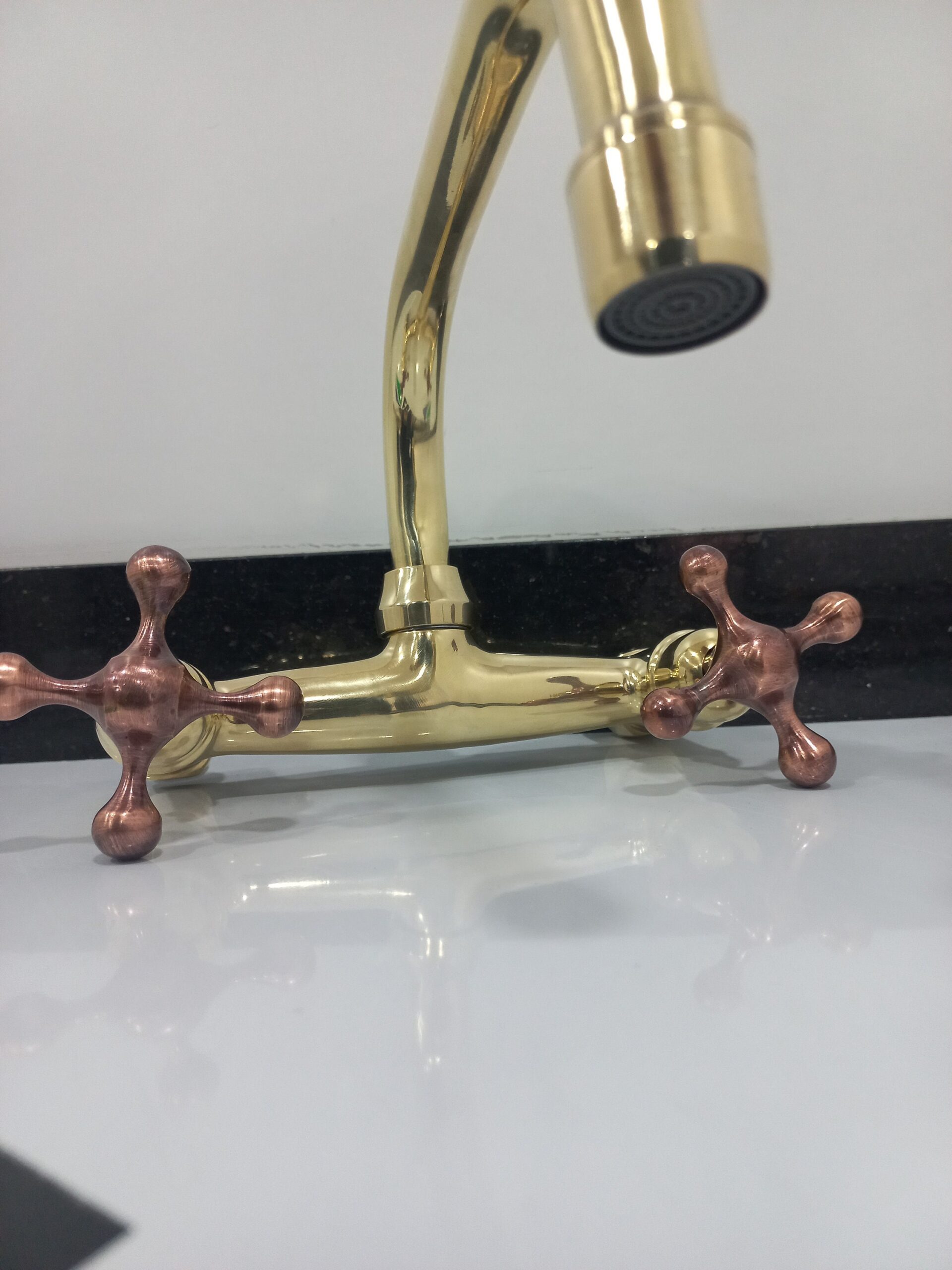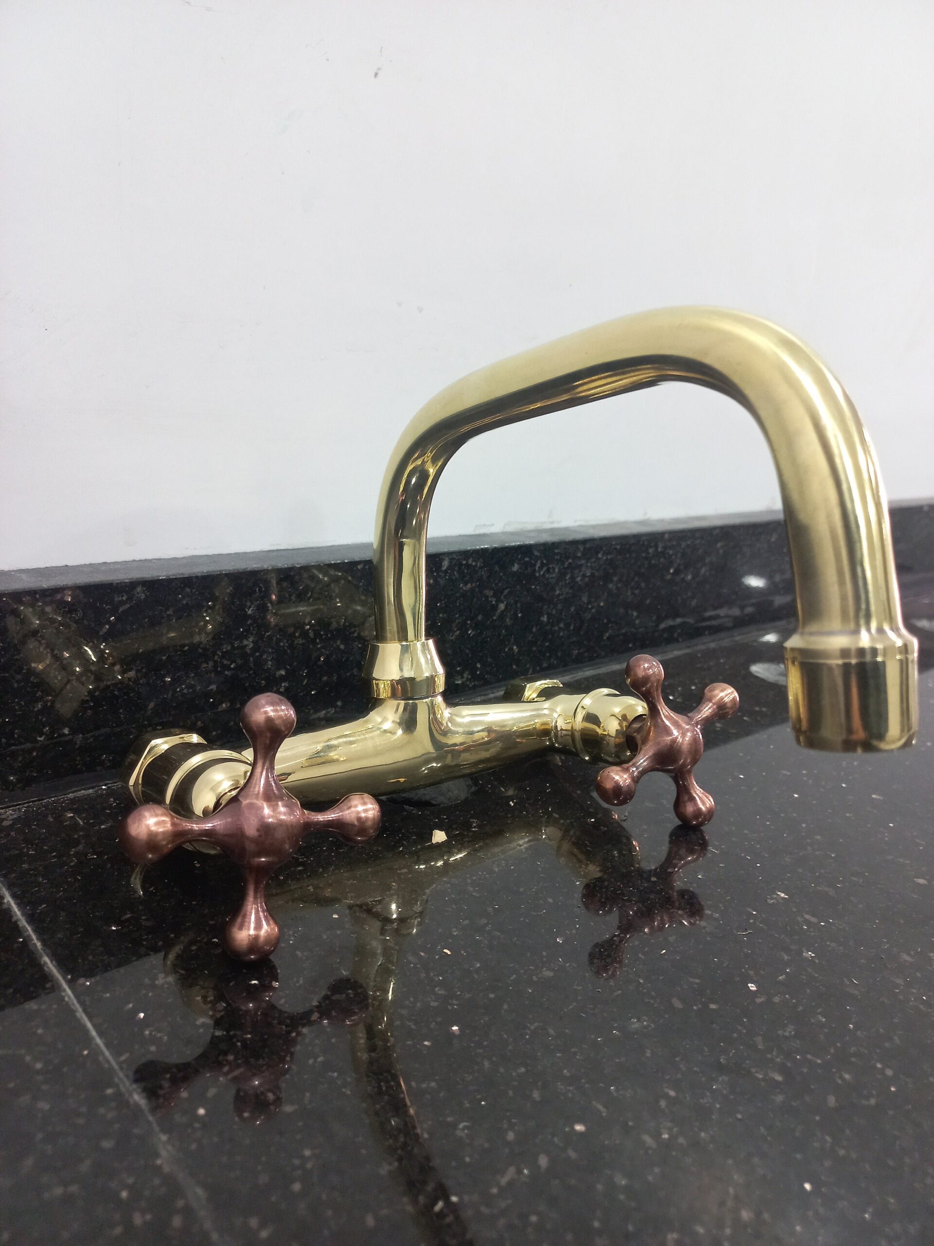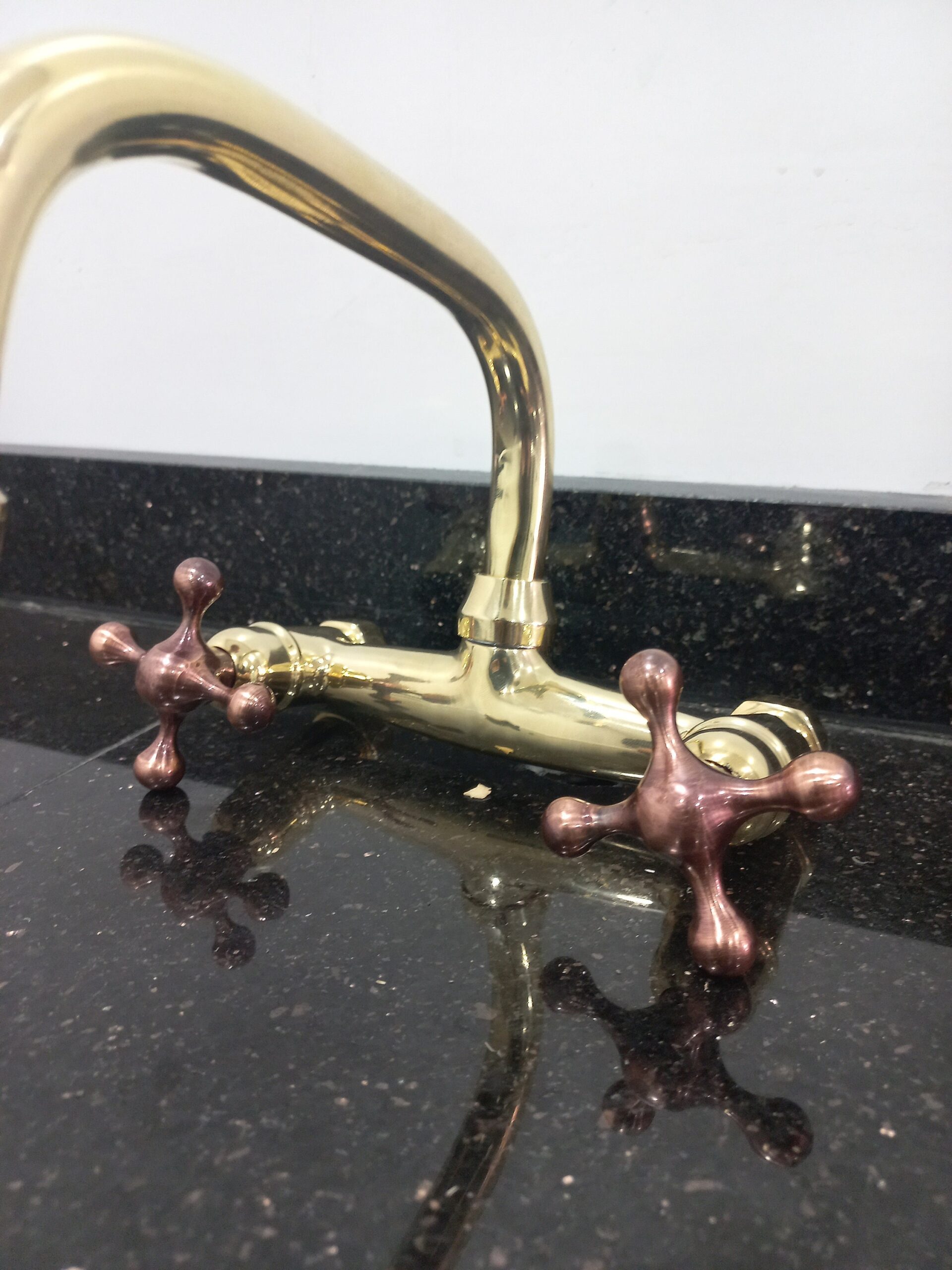 - This gorgeous solid brass kitchen faucet with short square spout is wall type, it is handcrafted and handcrafted from Morocco, exactly Marrakech, with standard American plumbing, makes it easy to install. This faucet has 2 handmade handles.