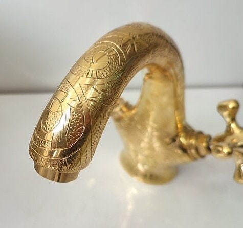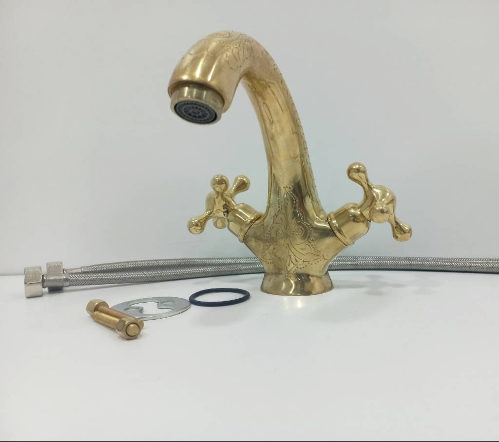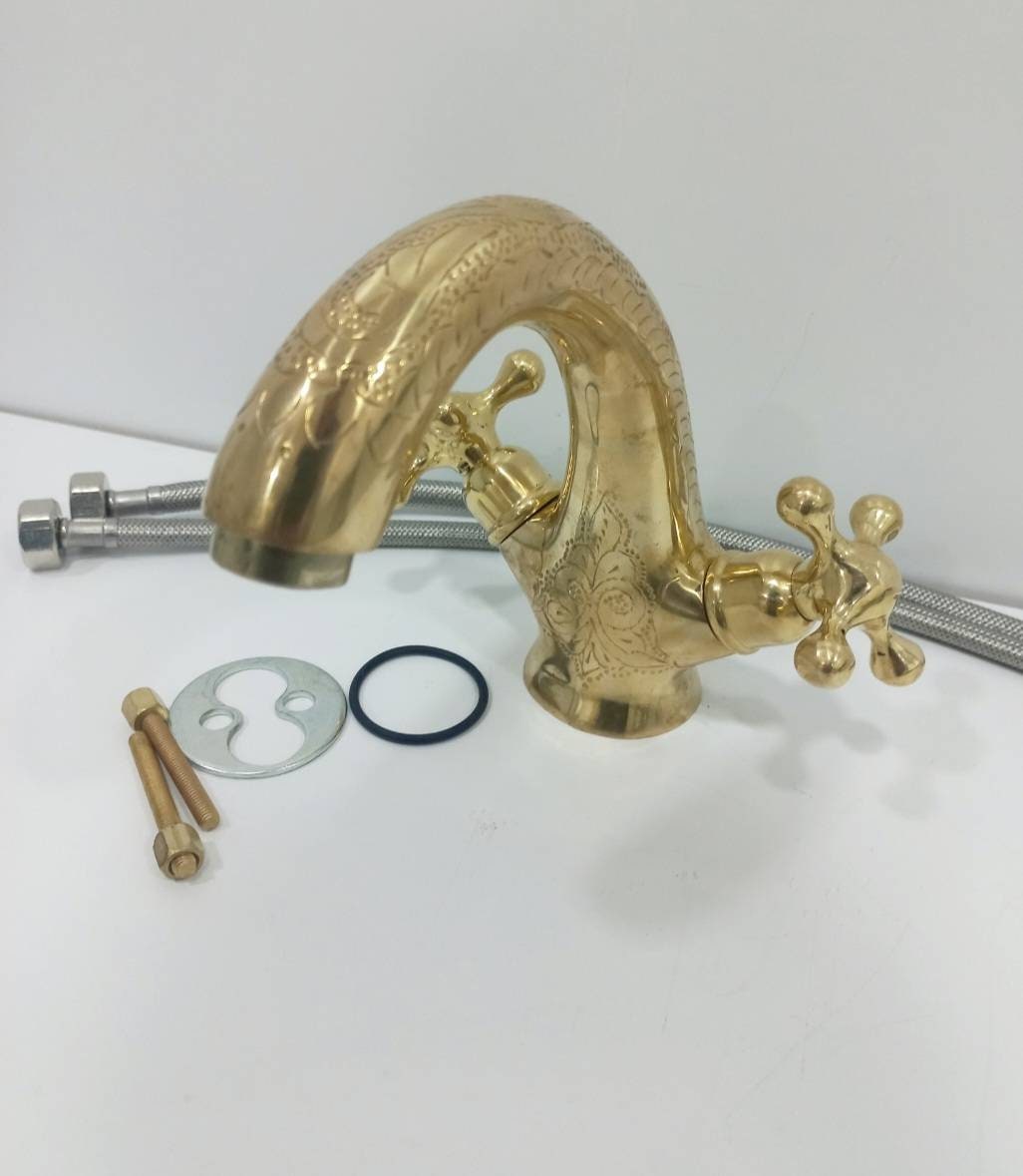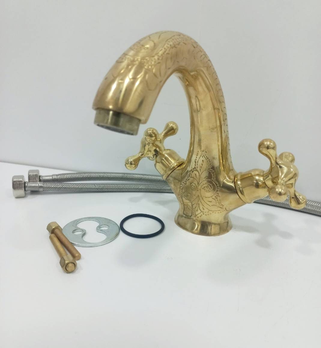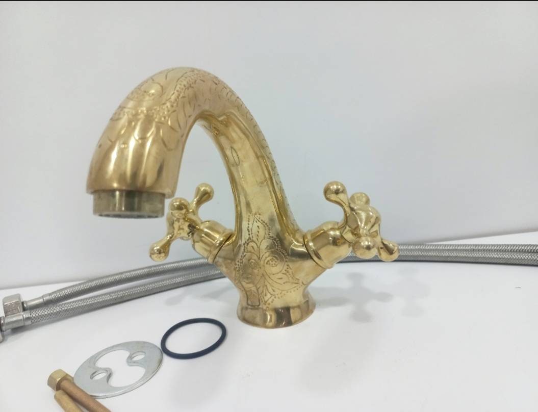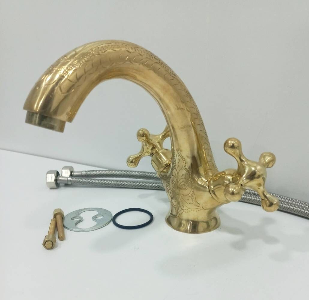 - Unlacquered brass faucet with simple cross handles, Beautifully hammered by Moroccan master craftsmen in Marrakech, this handcrafted brass tap from Marrakech is suitable for any interior with its simple shape and its uniform color.