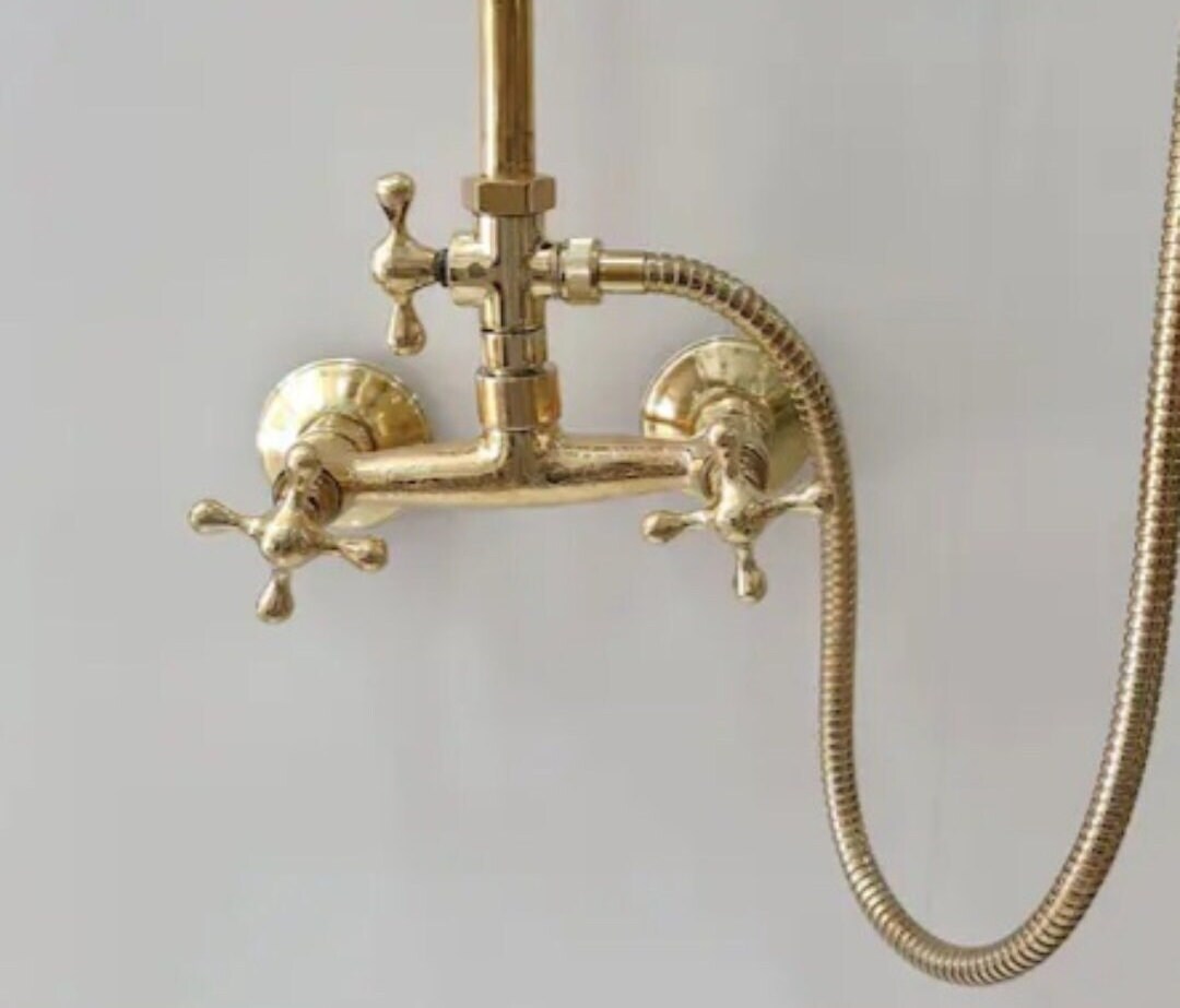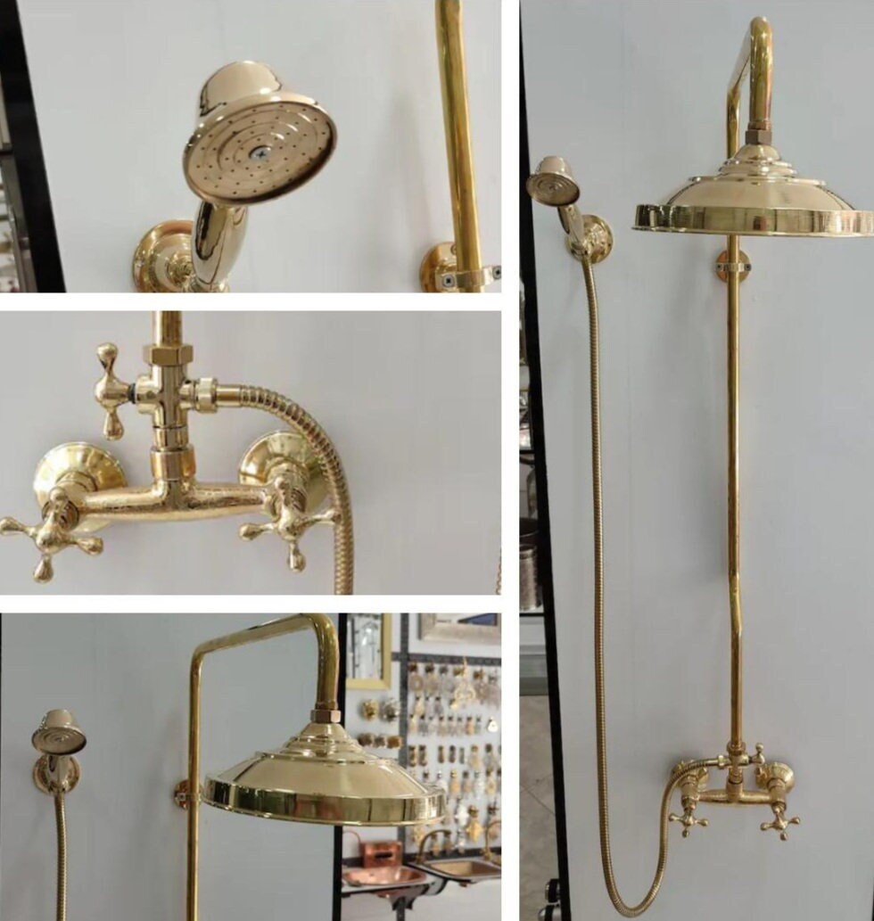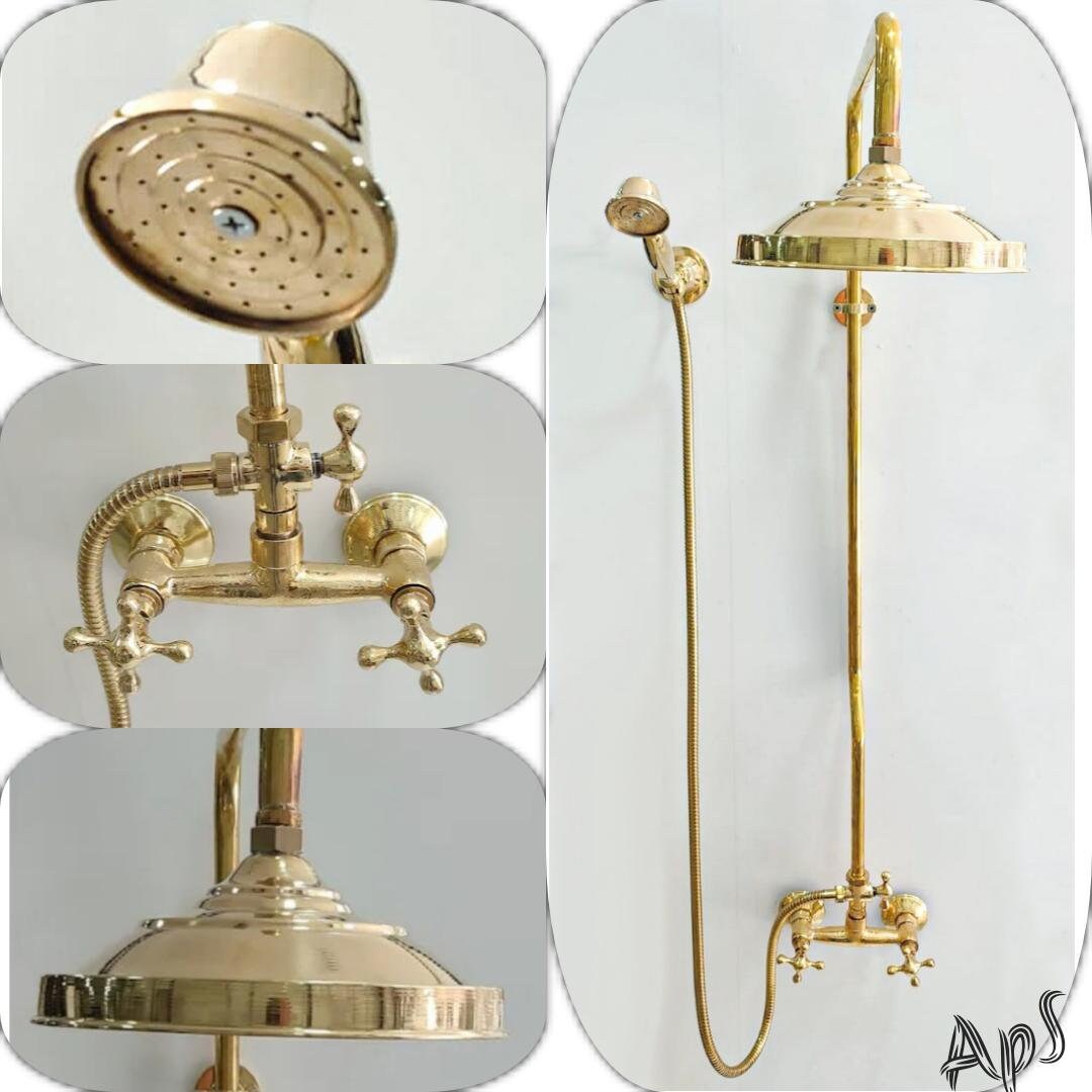 - traditional solid brass shower faucet with shower head and portable handcrafted by our artisans, its brass color and design bring a bit of rustic style and class to your bathroom.