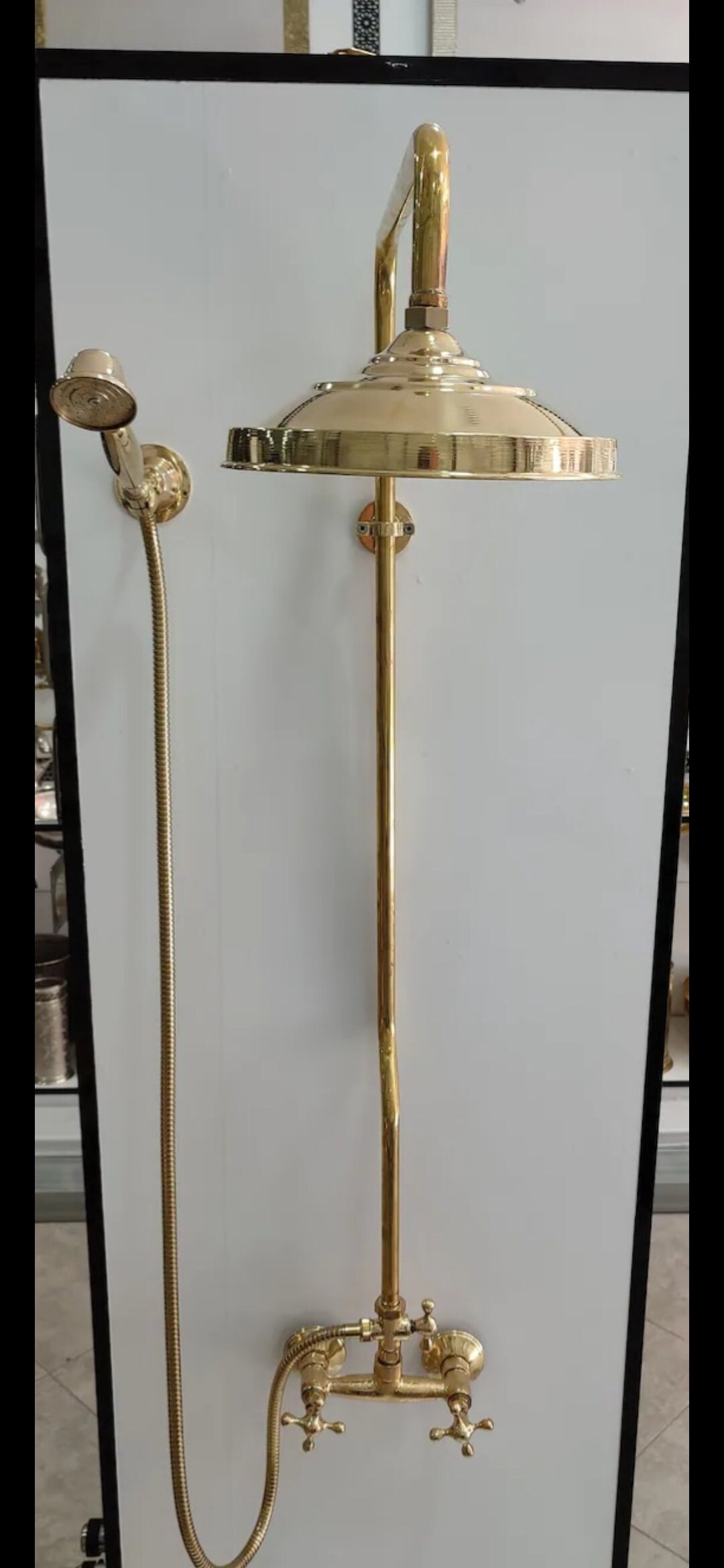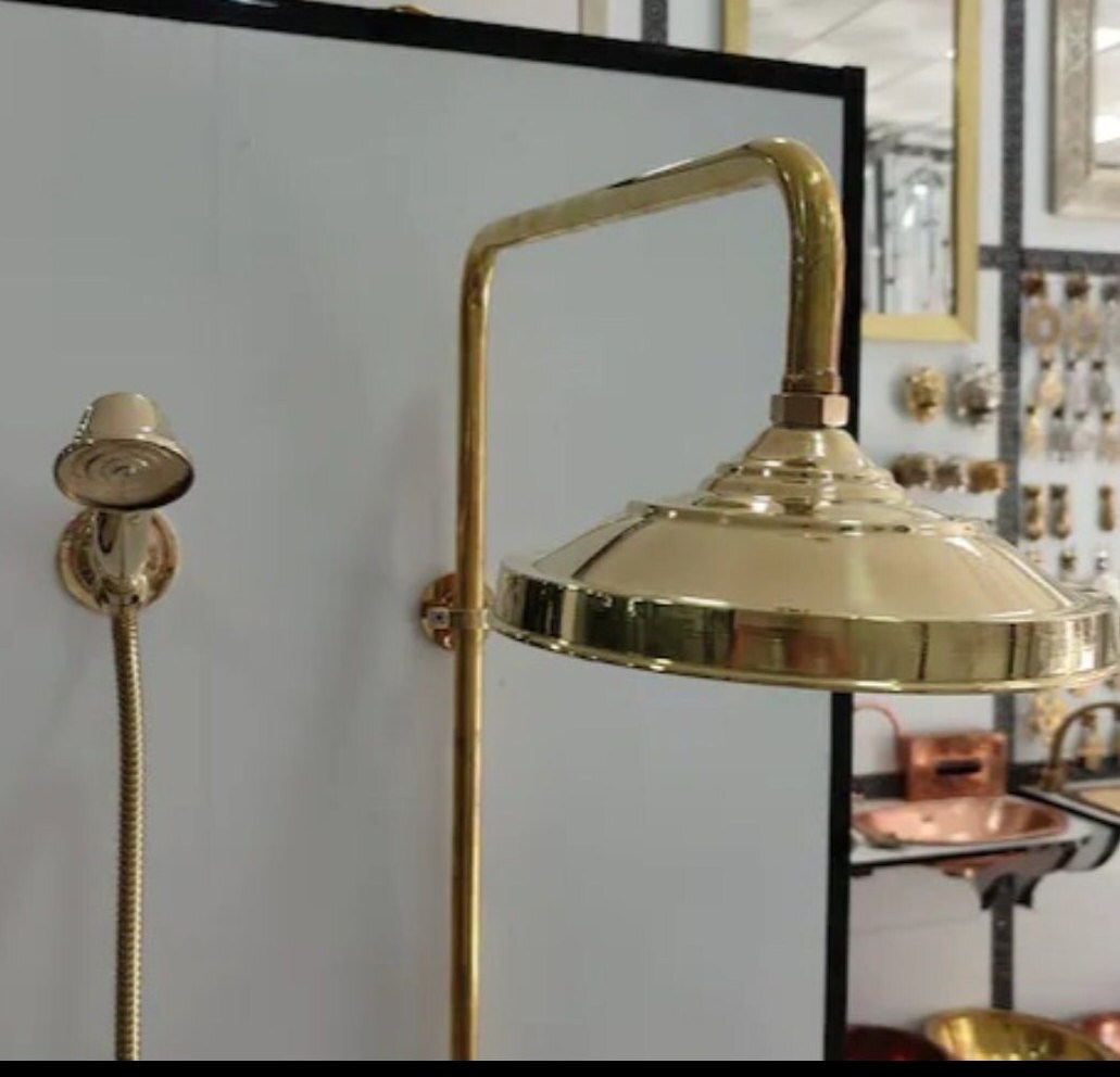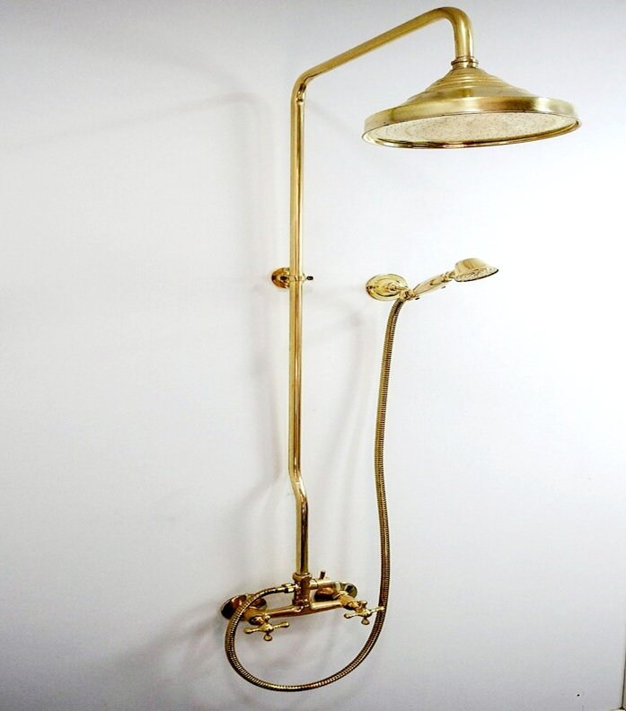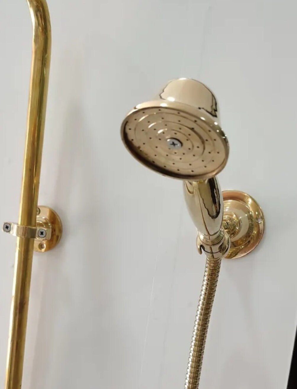 - traditional solid brass shower faucet with shower head and portable handcrafted by our artisans, its brass color and design bring a bit of rustic style and class to your bathroom.