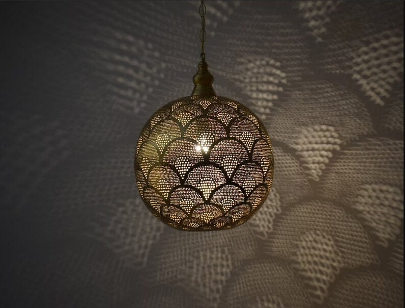 Illuminate your home with the exotic allure of our Artisan Brass Pendants. Thousands of hand-pierced holes create a stunning celestial pattern of light and shadow when lit.